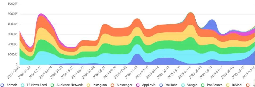雖然素材投放量一直不多(上圖),但“Gossip Harbor”在日本的素材展示量卻非常高(下圖),最高達到5000萬次|數據來源:廣大大
