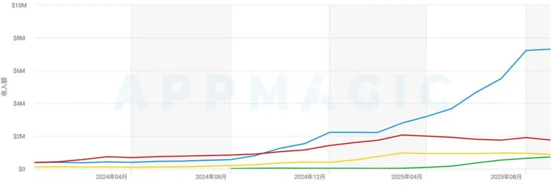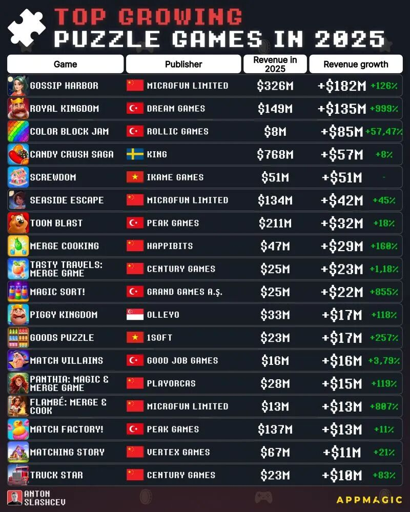 最近游戲媒體《Gamigion》根據AppMagic數據繪制的榜單發出了一個“喜人”的信號。這份榜單中,有至少8款出海休閑手游在2025年的流水同比增幅超過1000萬美元,占據了整個榜單約一半的席位。但是經過我們與AppMagic方面求證,這份榜單的對比的是2024年全年vs 2025年前9個月的數據。也就是說,如果以年為單位進行對比的話,2025年的實際增幅可能會更大。