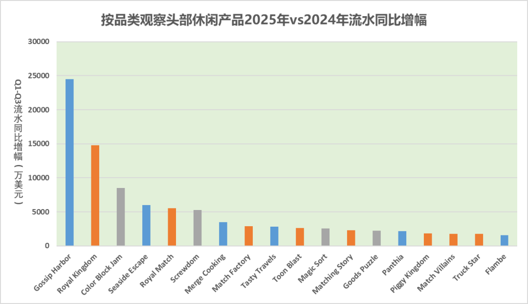 3. 根據總體數據情況,本文以1500萬美元作為流水同比增幅標準(約合1.07億人民幣),選取了2025年Q1—Q3流水增幅Top 18休閑產品進行分析比對。