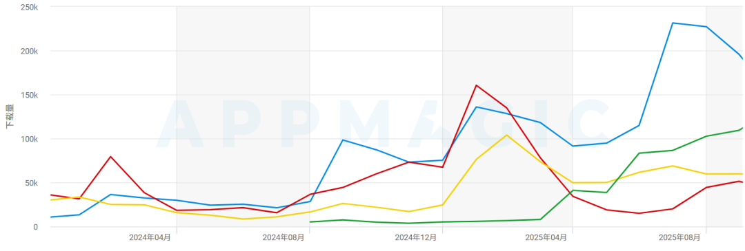 4款產品在日本的下載量進入到2025年后都有明顯增長,其中“Gossip Harbor”(藍色)最為明顯|數據來源:AppMagic